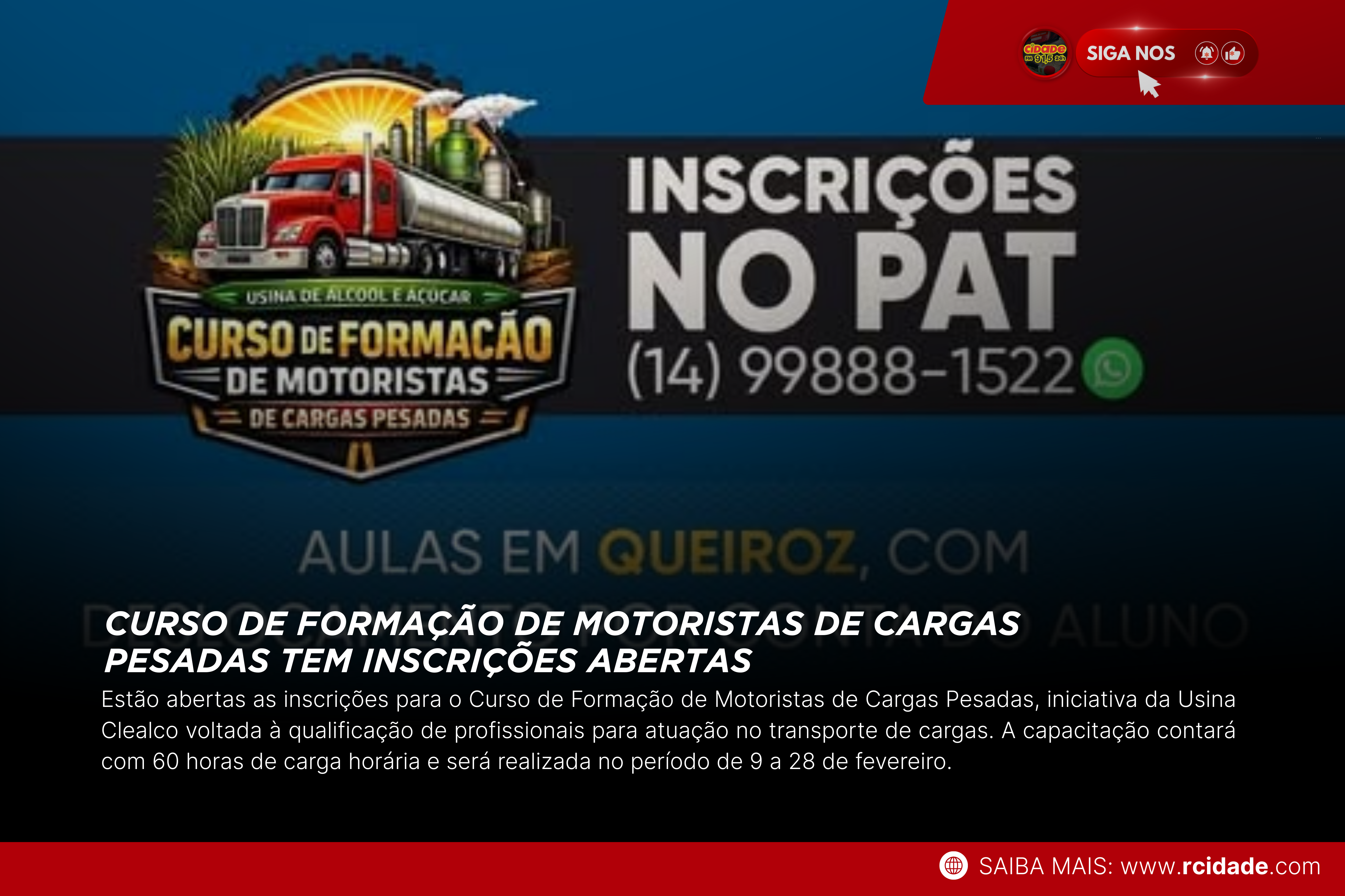 Estão abertas as inscrições para o Curso de Formação de Motoristas de Cargas Pesadas, iniciativa da Usina Clealco voltada à qualificação de profissionais para atuação