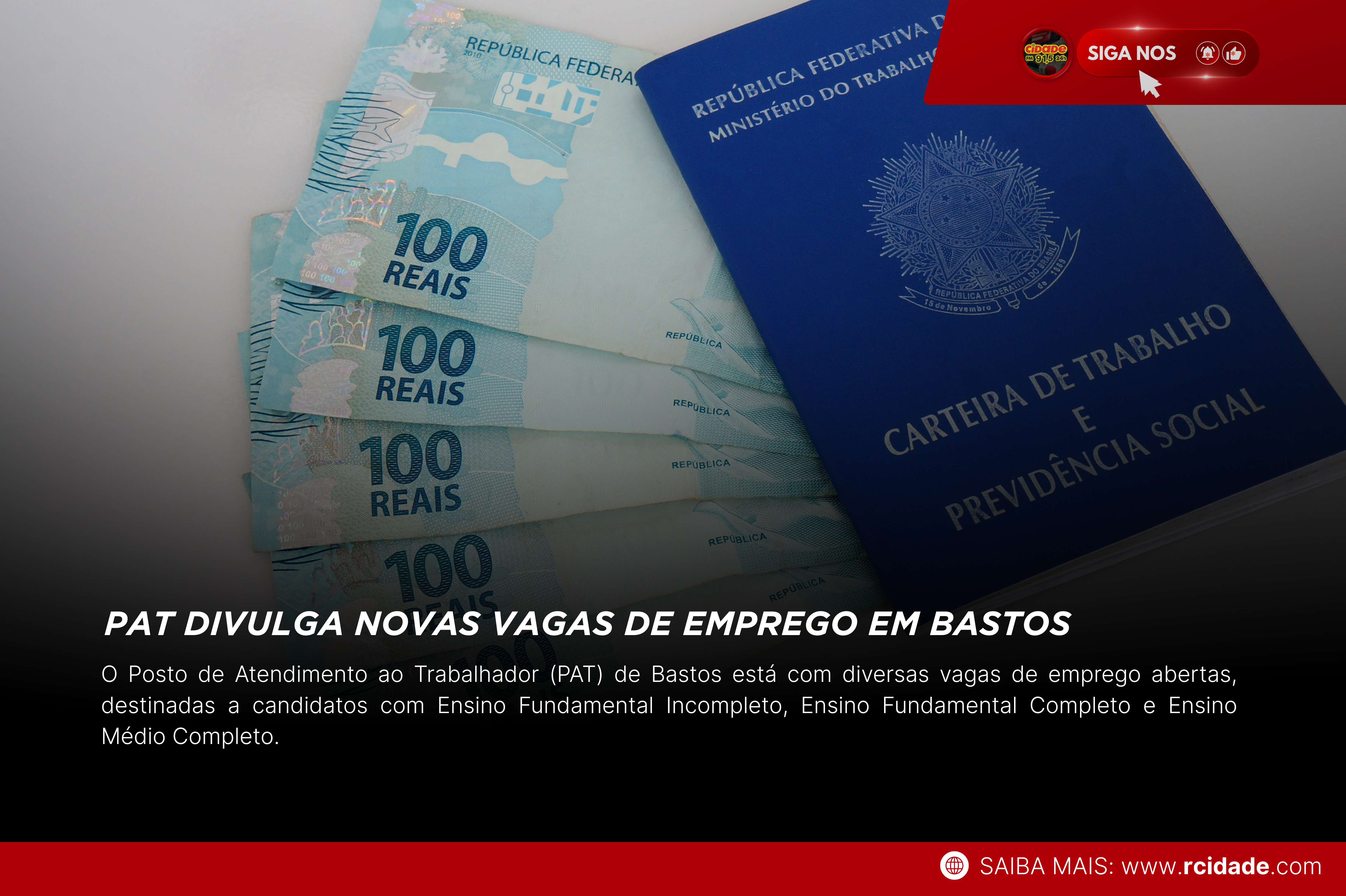 O Posto de Atendimento ao Trabalhador (PAT) de Bastos está com diversas vagas de emprego abertas, destinadas a candidatos com Ensino Fundamental Incompleto, Ensino Fundamental