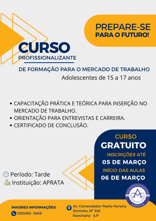 Geral A APRATA está com inscrições abertas para o Curso Profissionalizante de Formação para o Mercado de Trabalho, voltado para adolescentes de 15 a 17 anos. 26 de fevereiro de 2026 Nenhum comentário