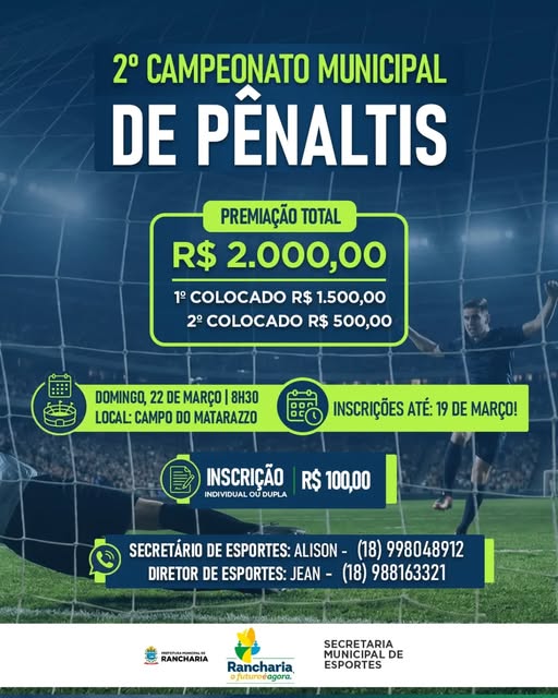Geral Vem aí o 2º Campeonato Municipal de Pênaltis de Rancharia! 19 de fevereiro de 2026 Nenhum comentário