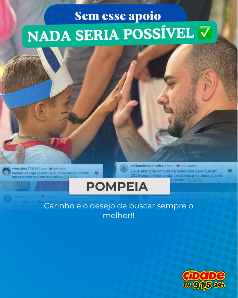 Pompeia, SP- O carinho que recebo de todos vocês dá sentido ao meu desejo de buscar sempre o melhor para Pompeia.Esse reconhecimento é o que