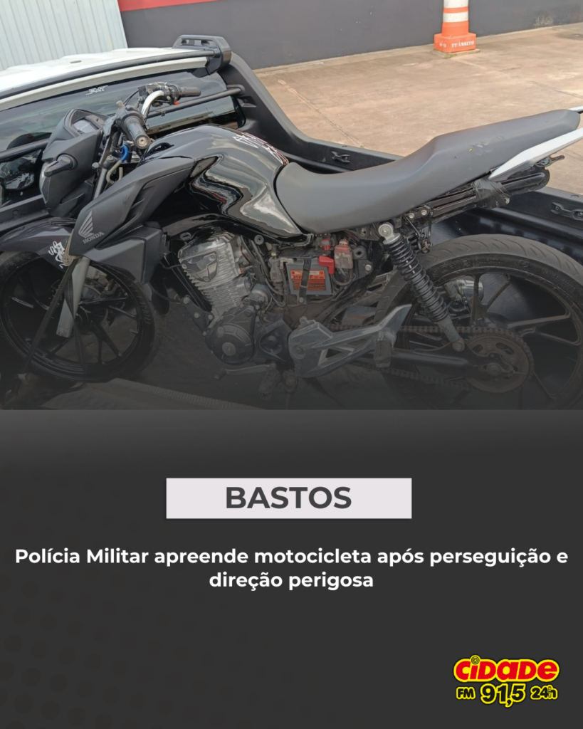por Alessandro Dias Bastos,SP- Uma motocicleta foi apreendida pela Polícia Militar durante uma ocorrência registrada na Rua das Andorinhas, em Bastos, na sexta-feira (27), no