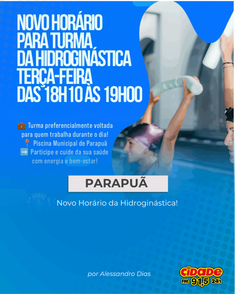 Parapuã, SP- Agora quem trabalha durante o dia também pode participar dessa atividade cheia de energia e bem-estar! Terça-feira, das 18h10 às 19h00, na Piscina