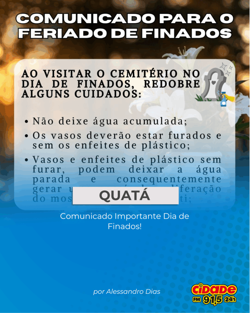 Quatá, SP- A Prefeuitura Municipal de Quatá faz algumas recomendações que devem ser tomadas pela população neste Dia de Finados. Acompanhe; Prefeitura Municipal de Quatá