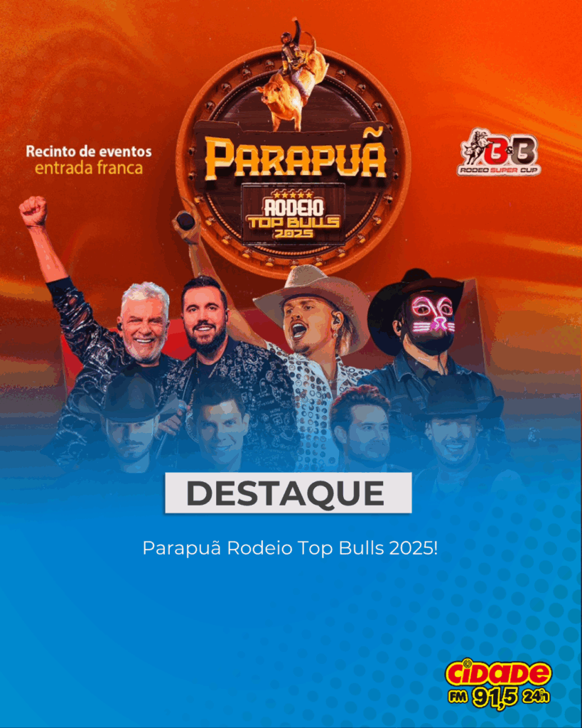 Parapuã Rodeio Top Bulls 2025 De 04 a 07 de dezembro, o Recinto de Eventos vai tremer com emoção, montarias e muita música boa! Entrada