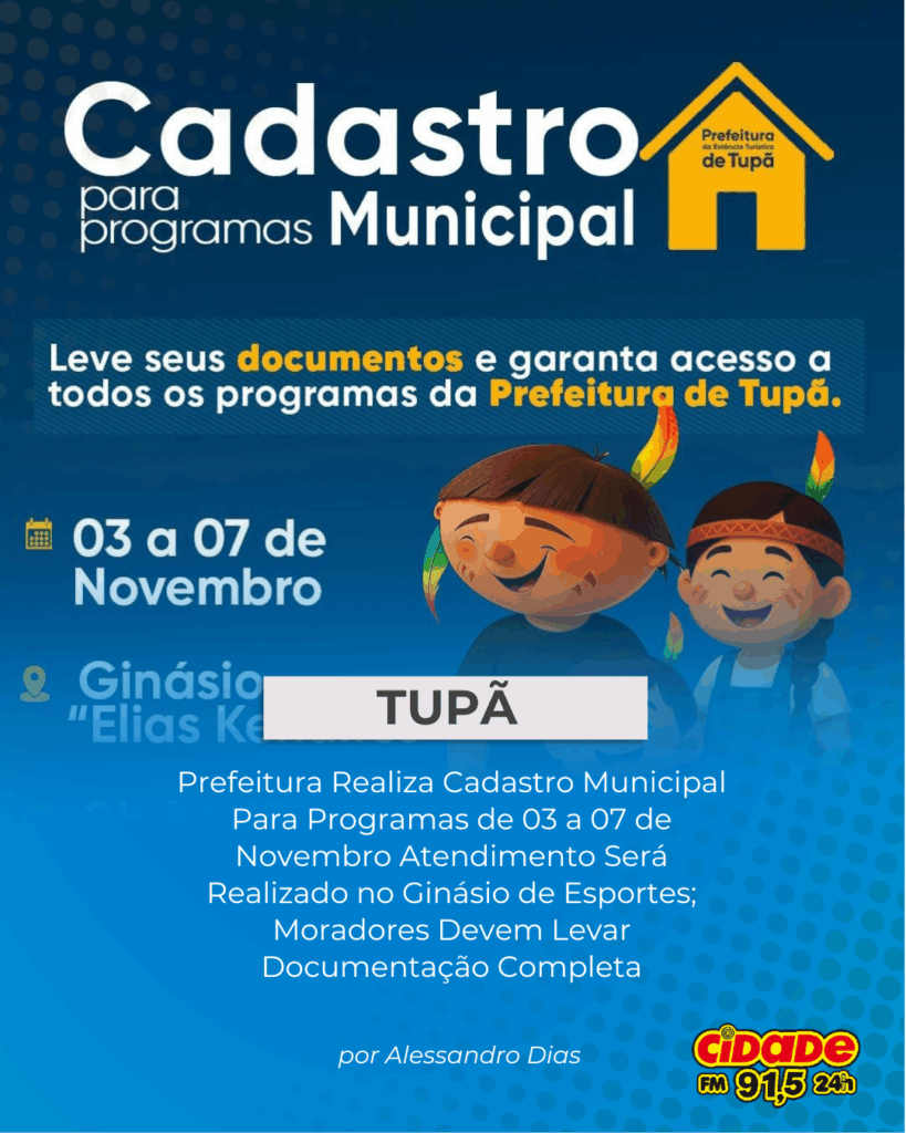Tupã, SP- Entre os dias 03 e 07 de novembro, a Prefeitura de Tupã estará realizando um Cadastro Municipal para Programas. O atendimento será realizado