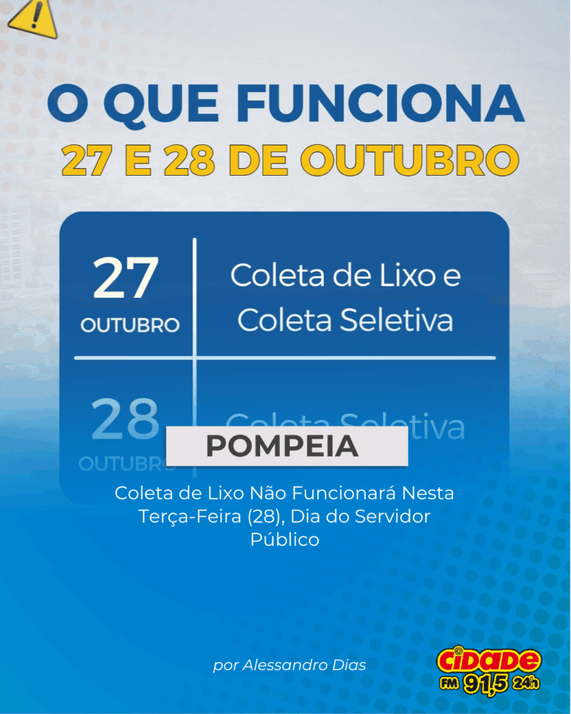 Pompeia, SP- Dia 28 de outubro é celebrado o Dia do Servidor Público, em razão disso alguns serviços públicos em Pompeia terão funcionamento especial. Porém,