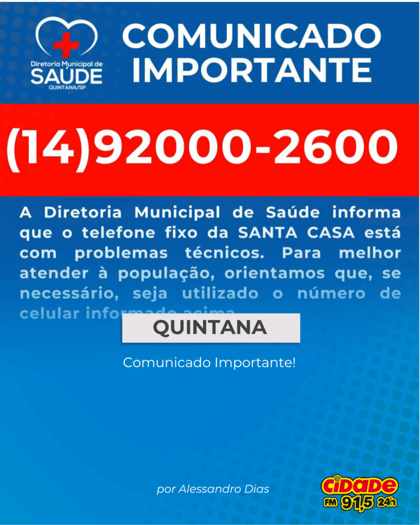 Quintana, SP- A Prefeitura de Quintana, por meio da Diretoria Municipal de Saúde, informa que o telefone fixo da Santa Casa está temporariamente fora de