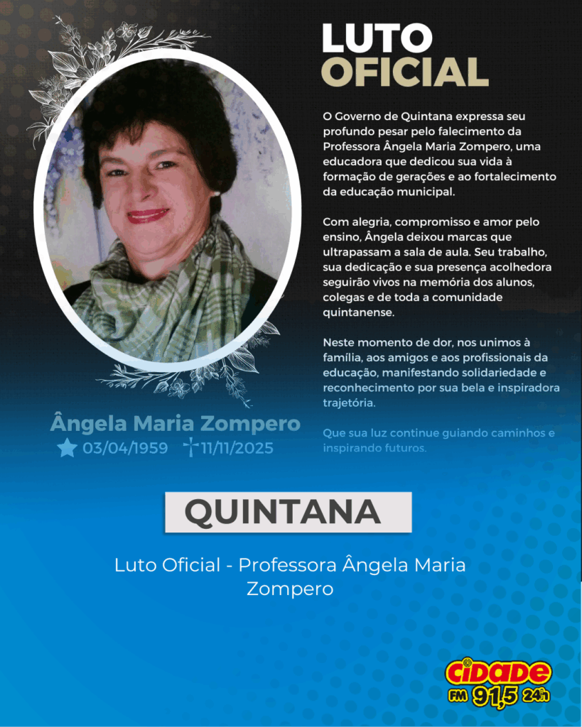 Quintana, SP- A Administração Municipal de Quintana decreta Luto Oficial pelo falecimento da Professora Ângela Maria Zompero, uma educadora que dedicou sua vida à formação