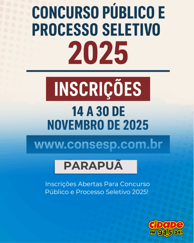 Parapuã, SP- A Prefeitura Municipal de Parapuã informa que estão abertas as inscrições para o Concurso Público nº 001/2025 e o Processo Seletivo nº 001/2025,