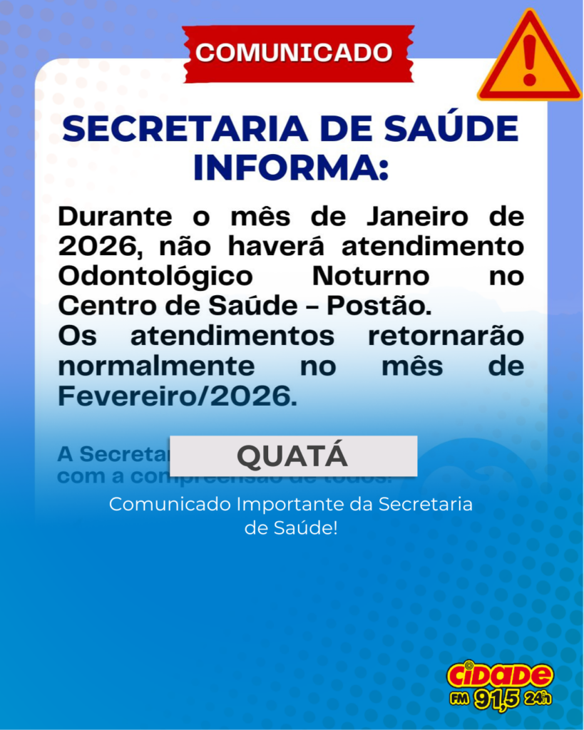 Quatá, SP- A Secretaria Municipal de Saúde informa à população, que durante o mês de Janeiro de 2026 não haverá atendimento odontológico no período noturno