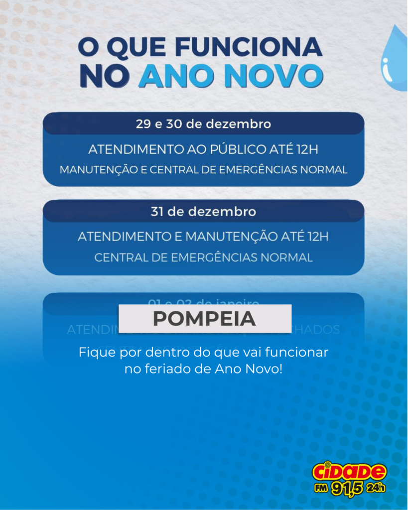 Pompeia, SP-O Plantão de Emergências funcionará normalmente, garantindo atendimento sempre que necessário. Em casos de emergência, ligue: (14) 3452-1223 Desejamos a todos um Ano Novo