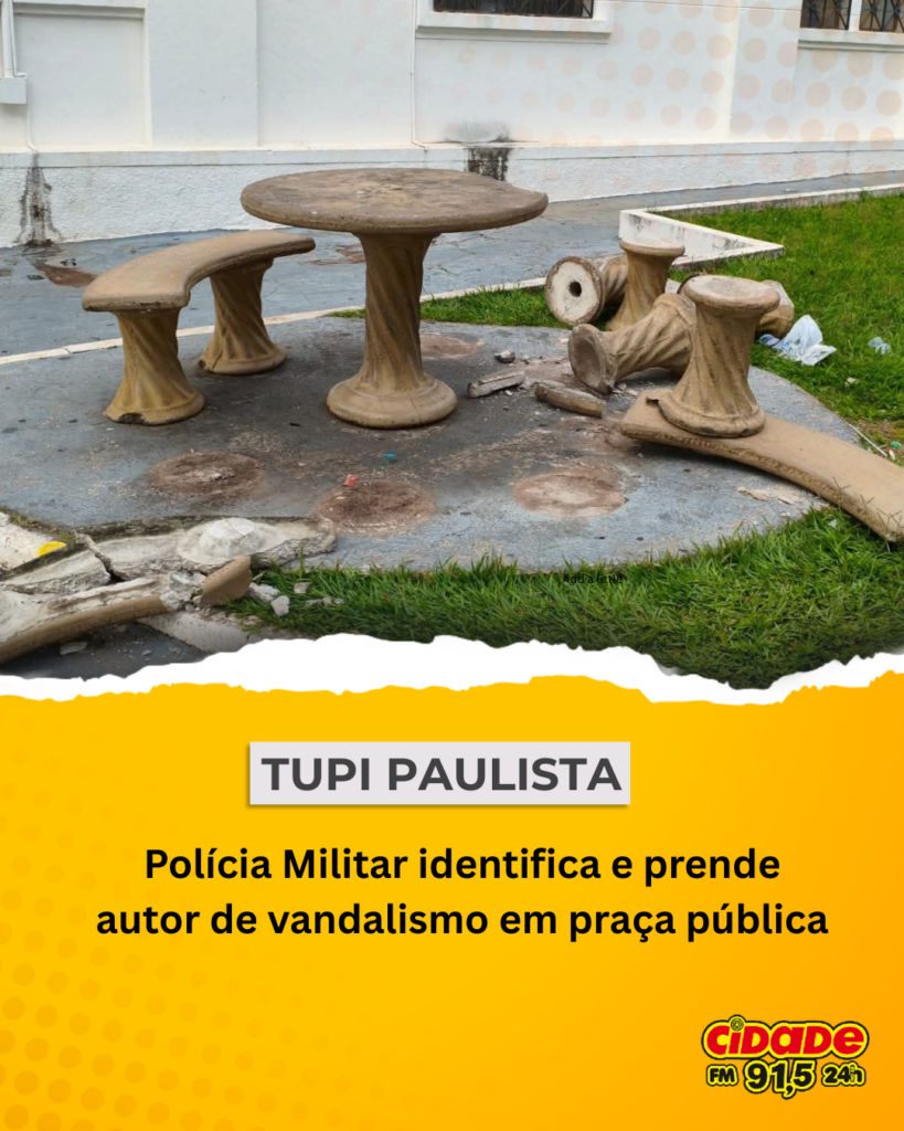 por Alessandro Dias Tupi Paulista, SP- A Polícia Militar identificou, localizou e prendeu o autor da destruição dos bancos de cimento da praça pública em