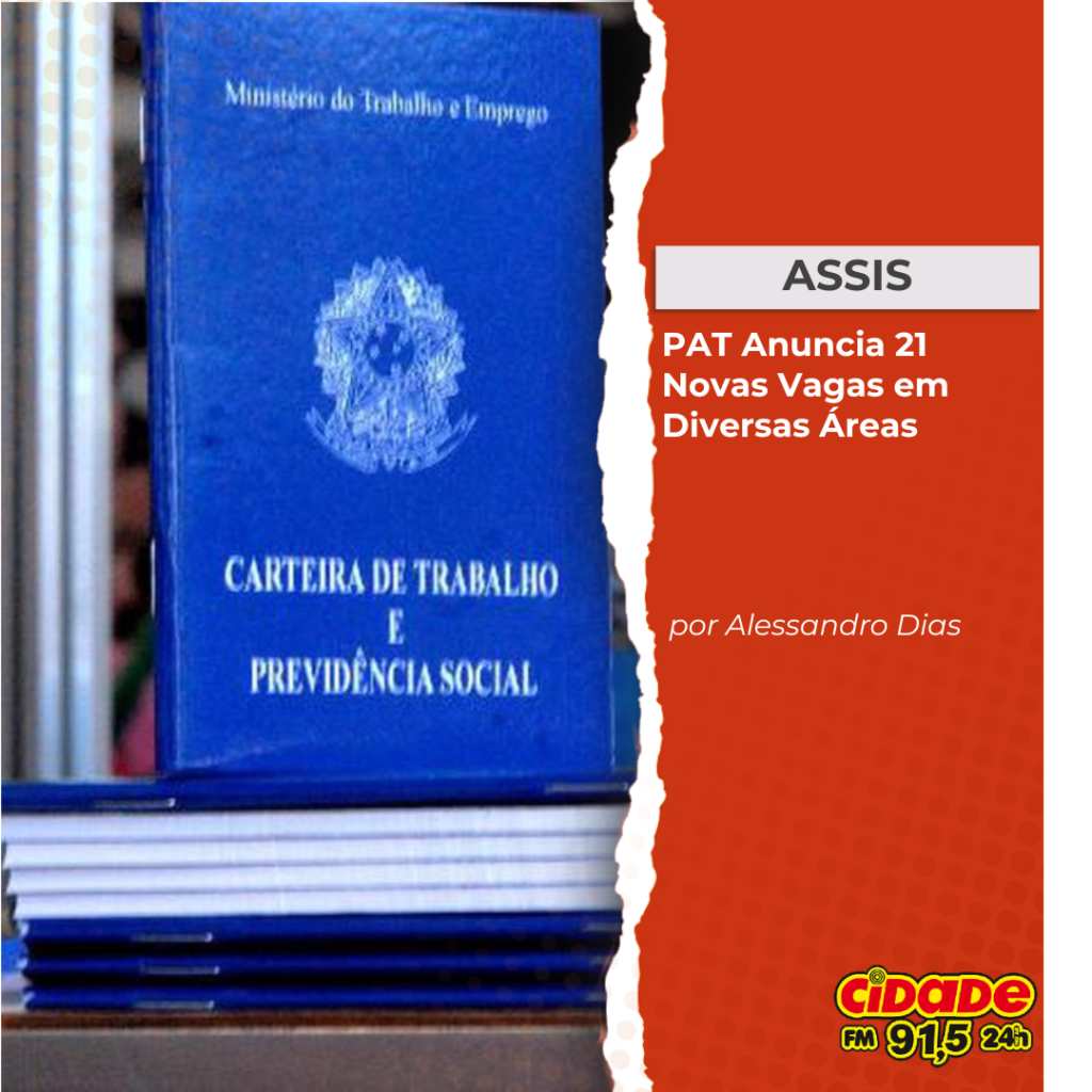 por Alessandro Dias Assis, SP- O Posto de Atendimento ao Trabalhador (PAT) de Assis divulgou 21 novas vagas de emprego para esta semana, contemplando várias