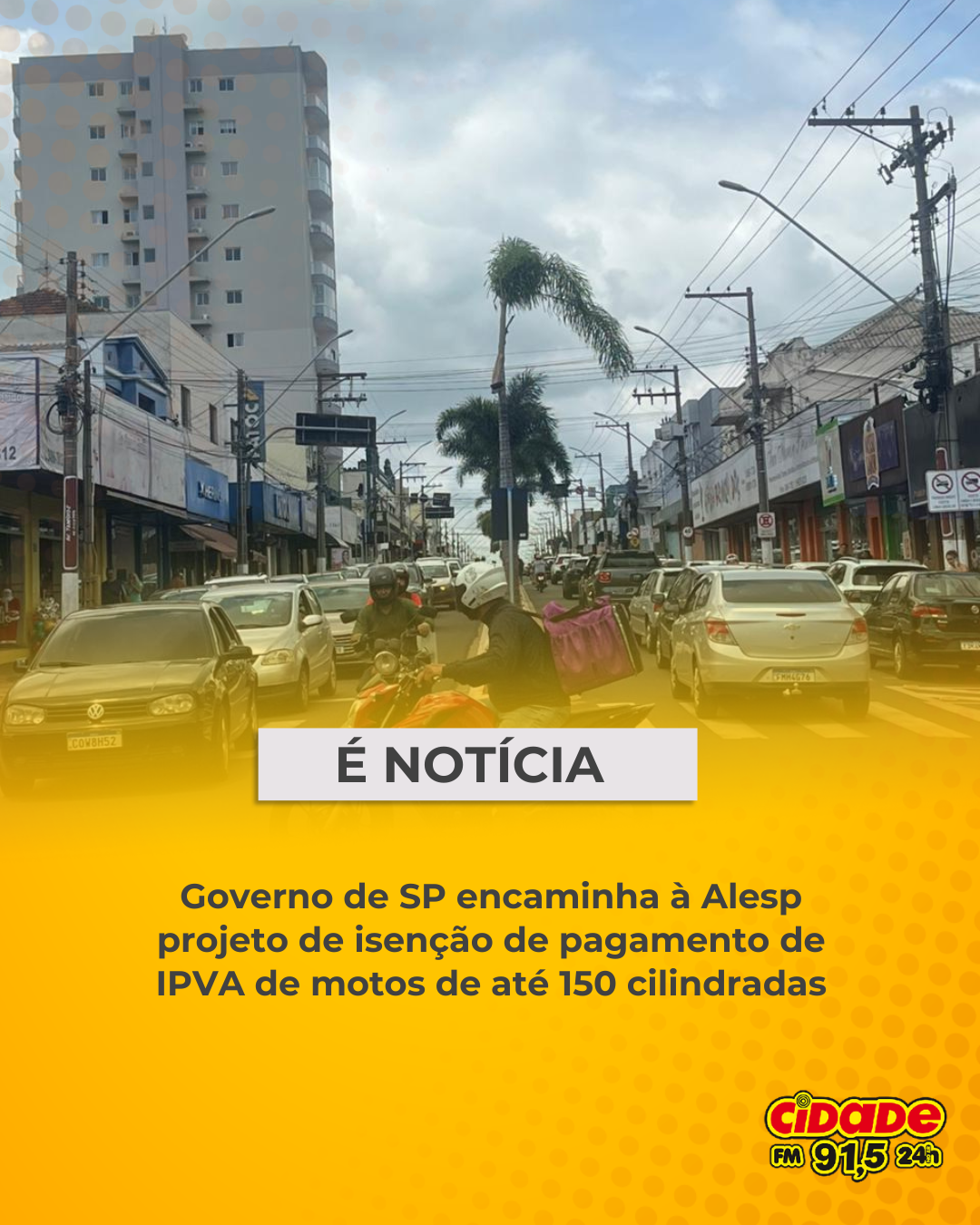 Geral É NOTÍCIA: Governo de SP encaminha à Alesp projeto de isenção de pagamento de IPVA de motos de até 150 cilindradas 14 de dezembro de 2025 Nenhum comentário