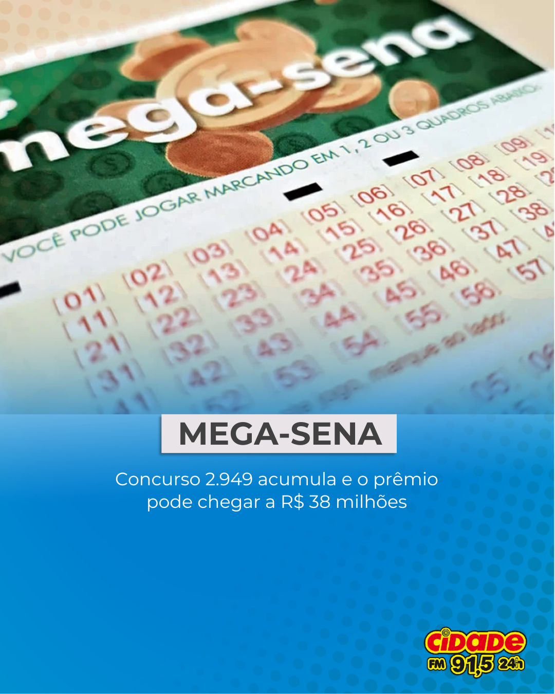 Geral MEGA-SENA: Concurso 2.949 acumula e o prêmio pode chegar a R$ 38 milhões 10 de dezembro de 2025 Nenhum comentário