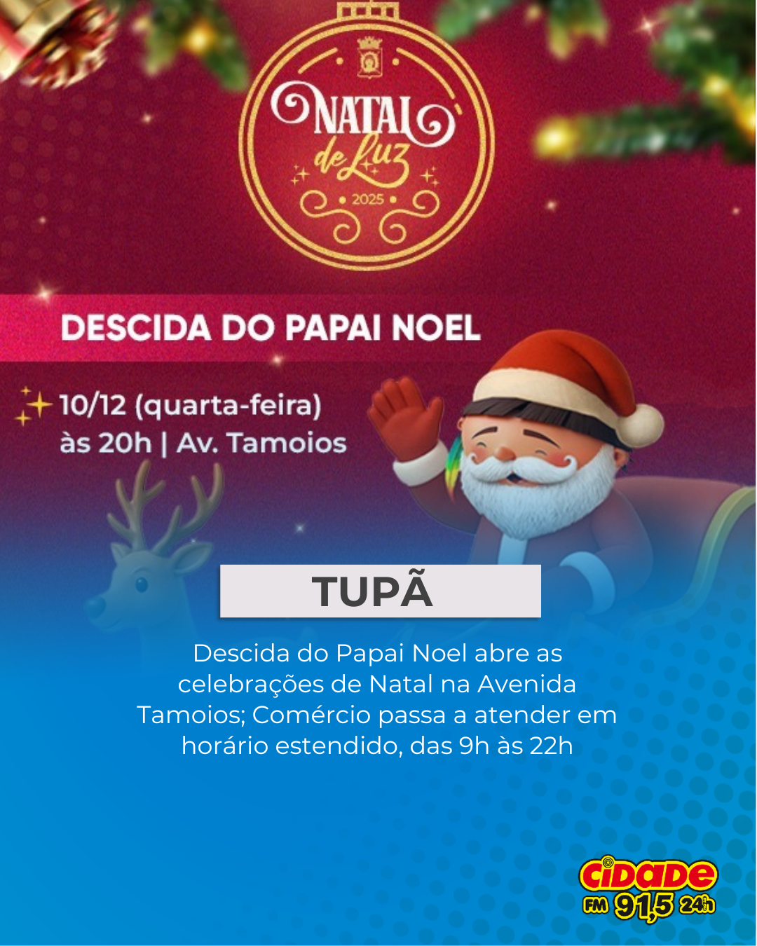 Geral TUPÃ: Descida do Papai Noel abre as celebrações de Natal na Avenida Tamoios; Comércio passa a atender em horário estendido, das 9h às 22h 10 de dezembro de 2025 Nenhum comentário
