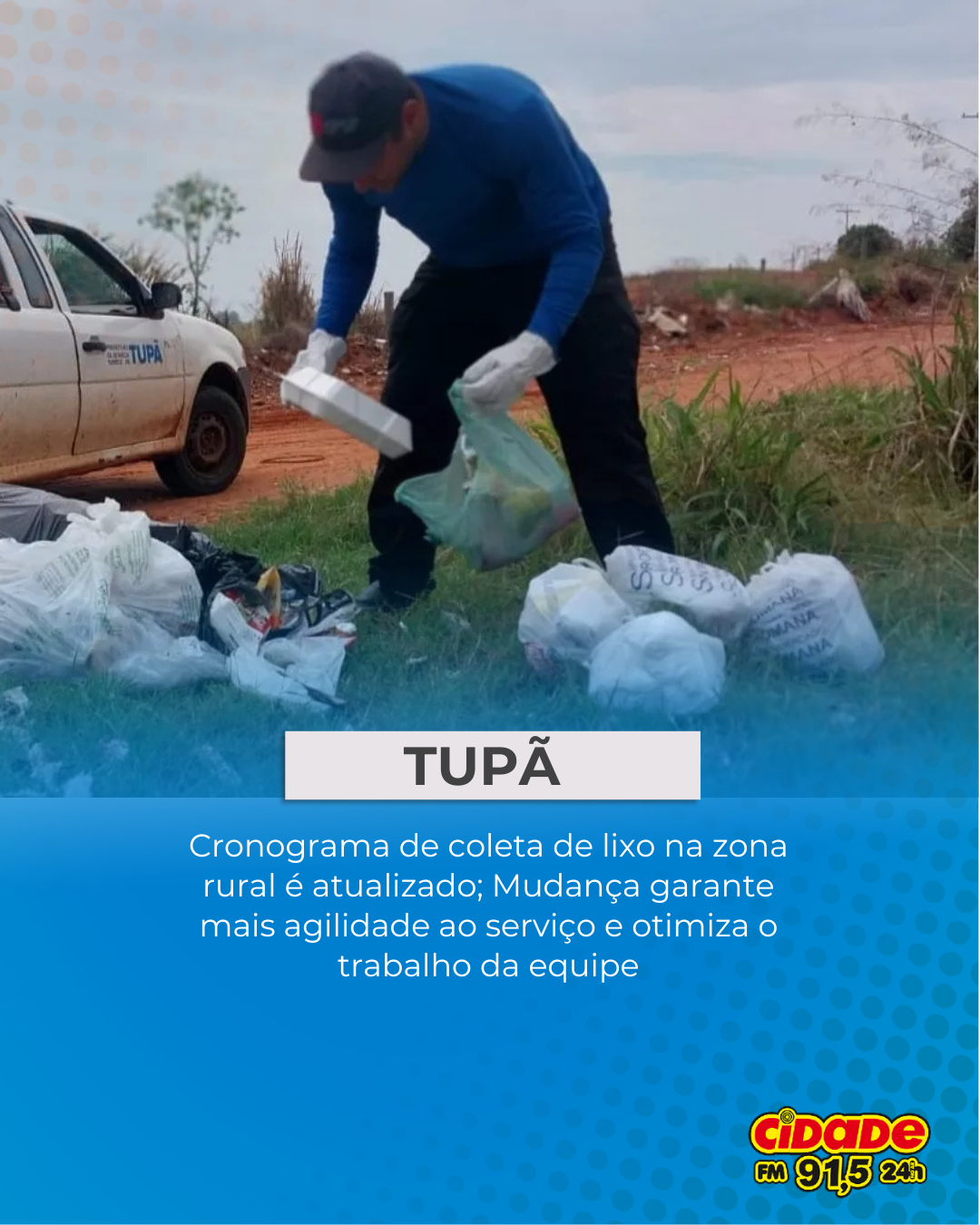 Geral TUPÃ: Cronograma de coleta de lixo na zona rural é atualizado; Mudança garante mais agilidade ao serviço e otimiza o trabalho da equipe 9 de dezembro de 2025 Nenhum comentário