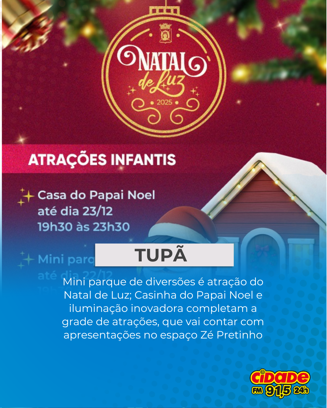 Geral TUPÃ: Mini parque de diversões é atração do Natal de Luz; Casinha do Papai Noel e iluminação inovadora completam a grade de atrações, que vai contar com apresentações no espaço Zé Pretinho 8 de dezembro de 2025 Nenhum comentário