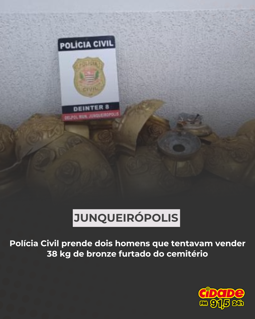 Geral JUNQUEIRÓPOLIS: Polícia Civil prende dois homens que tentavam vender 38 kg de bronze furtado do cemitério 8 de dezembro de 2025 Nenhum comentário