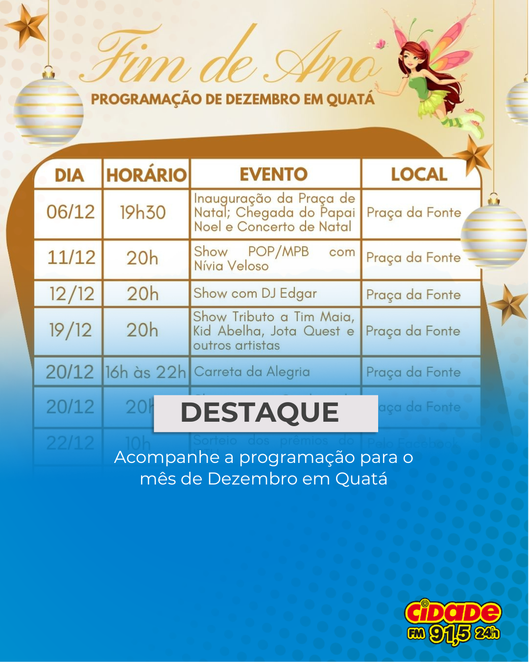 Geral DESTAQUE: Acompanhe a programação para o mês de Dezembro em Quatá 4 de dezembro de 2025 Nenhum comentário