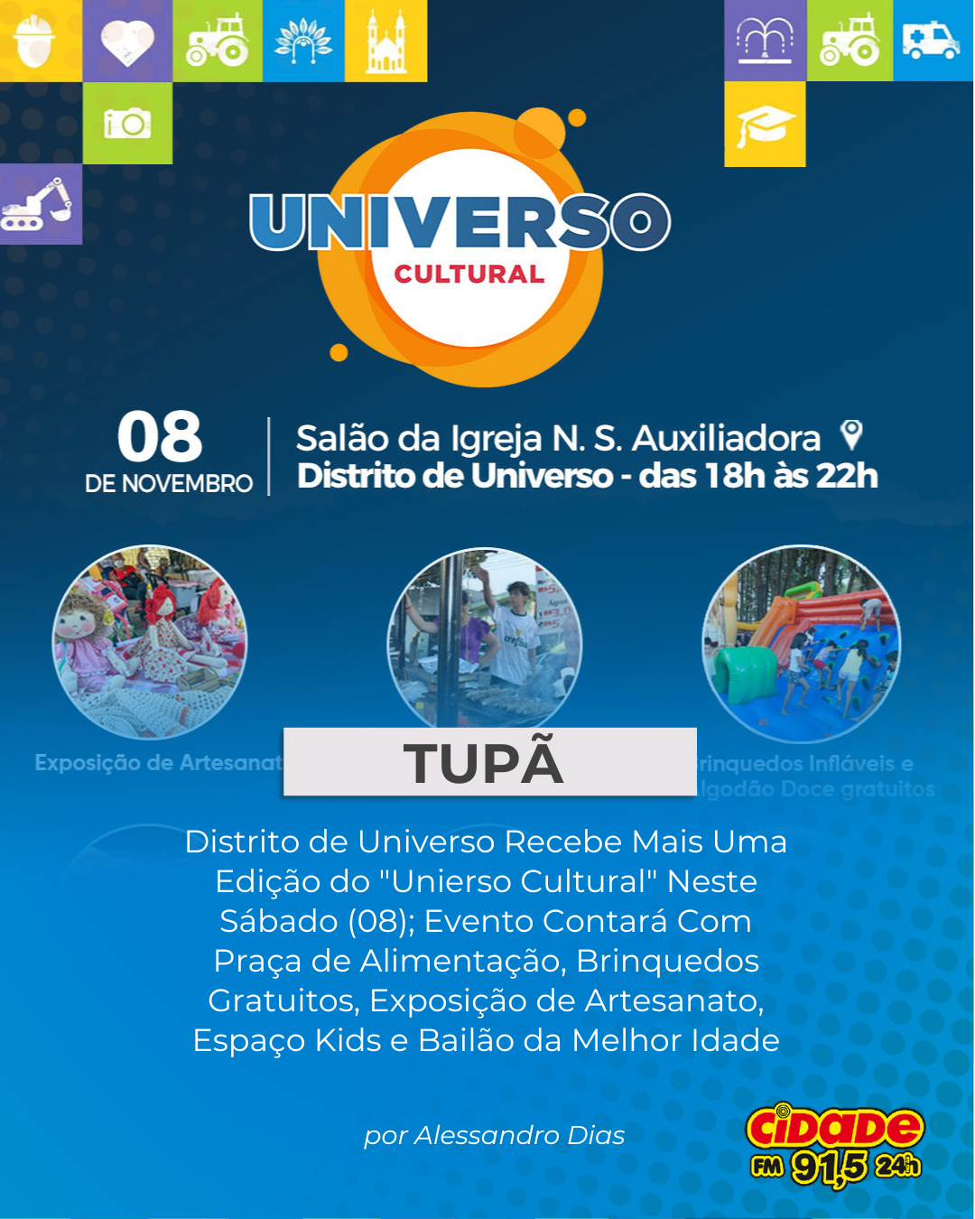 Geral TUPÃ: Distrito de Universo Recebe Mais Uma Edição do “Unierso Cultural” Neste Sábado (08); Evento Contará Com Praça de Alimentação, Brinquedos Gratuitos, Exposição de Artesanato, Espaço Kids e Bailão da Melhor Idade 5 de novembro de 2025 Nenhum comentário
