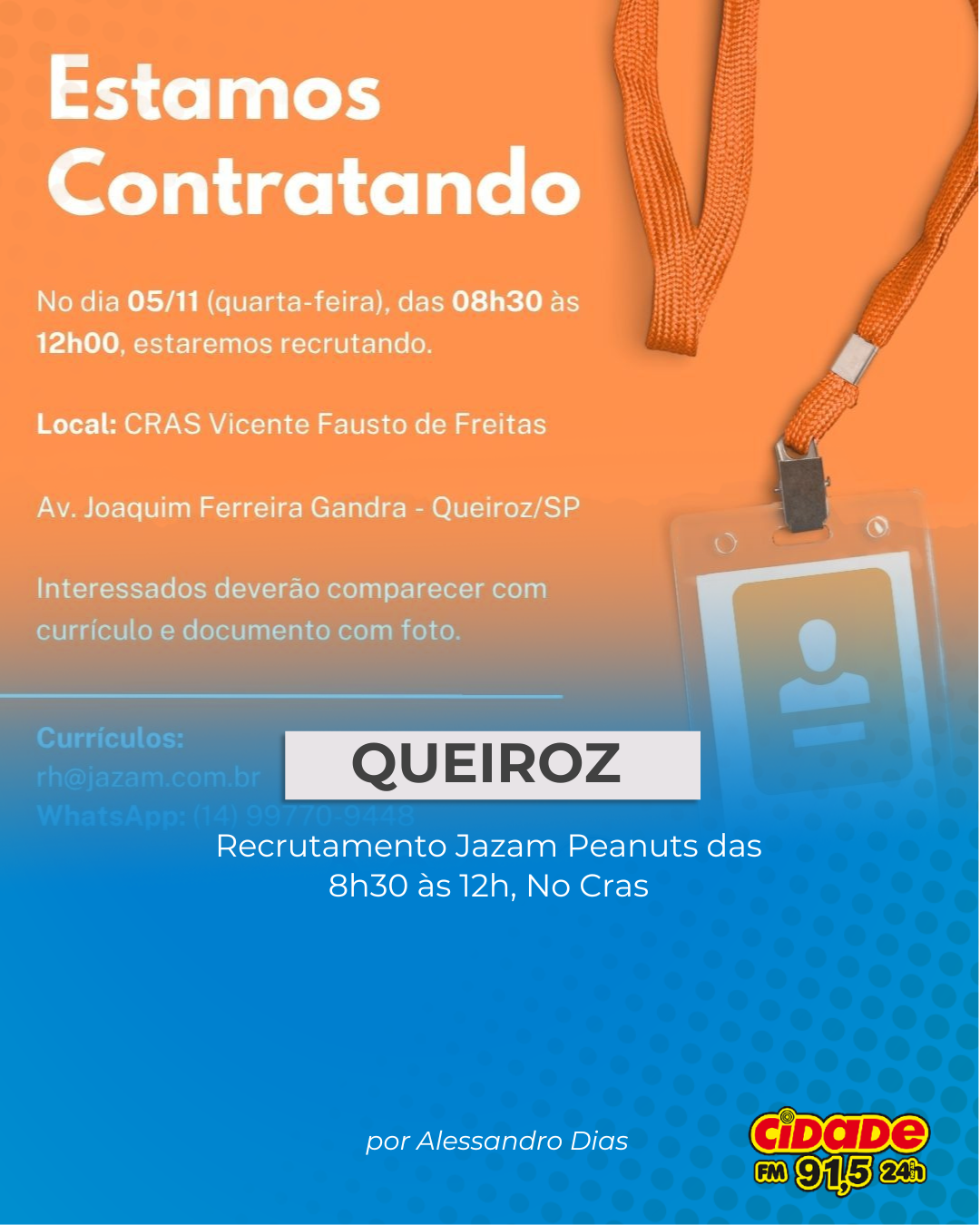 Geral QUEIROZ: Recrutamento Jazam Peanuts das 8h30 às 12h, No Cras 4 de novembro de 2025 Nenhum comentário