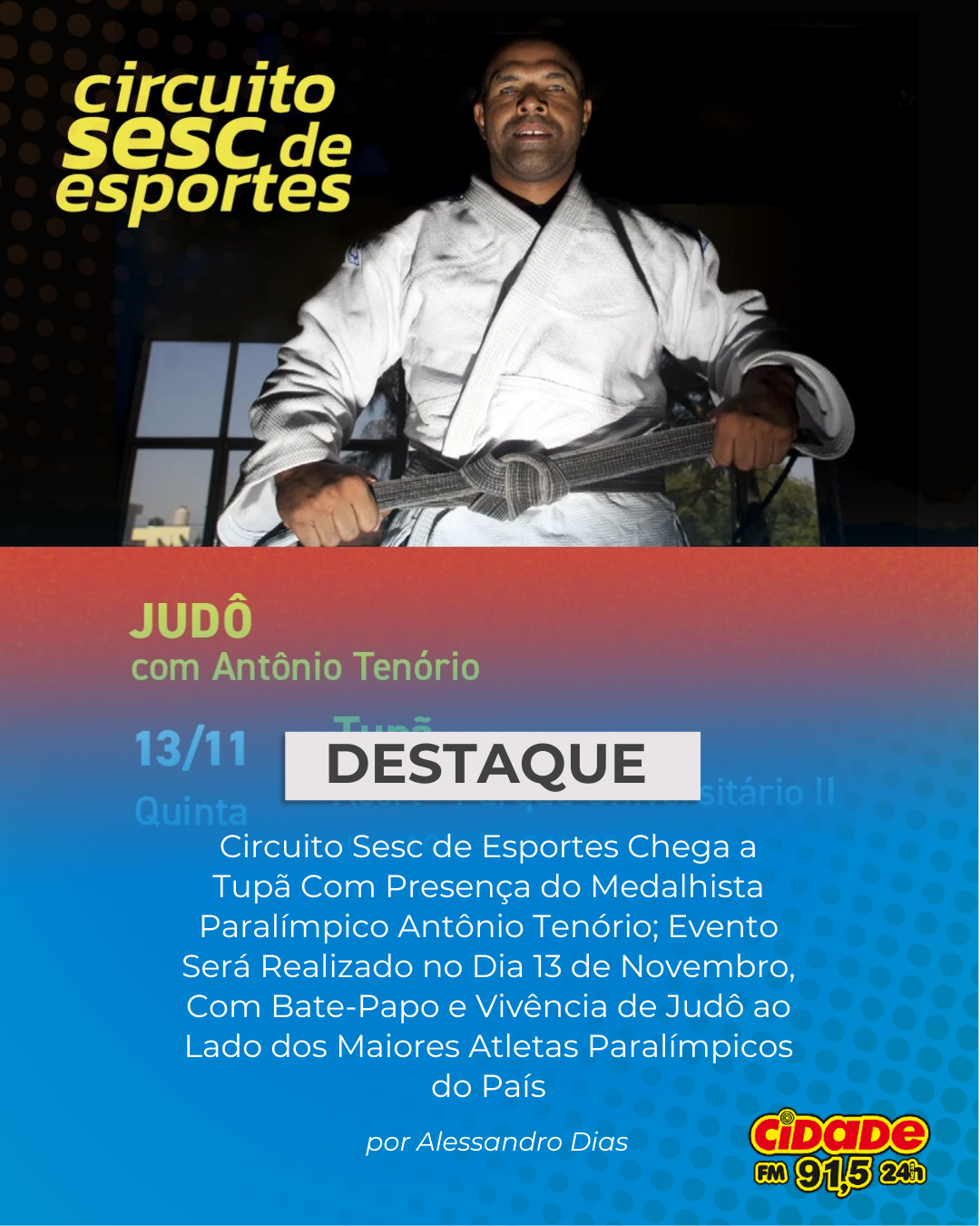 Geral DESTAQUE: Circuito Sesc de Esportes Chega a Tupã Com Presença do Medalhista Paralímpico Antônio Tenório; Evento Será Realizado no Dia 13 de Novembro, Com Bate-Papo e Vivência de Judô ao Lado dos Maiores Atletas Paralímpicos do País 4 de novembro de 2025 Nenhum comentário