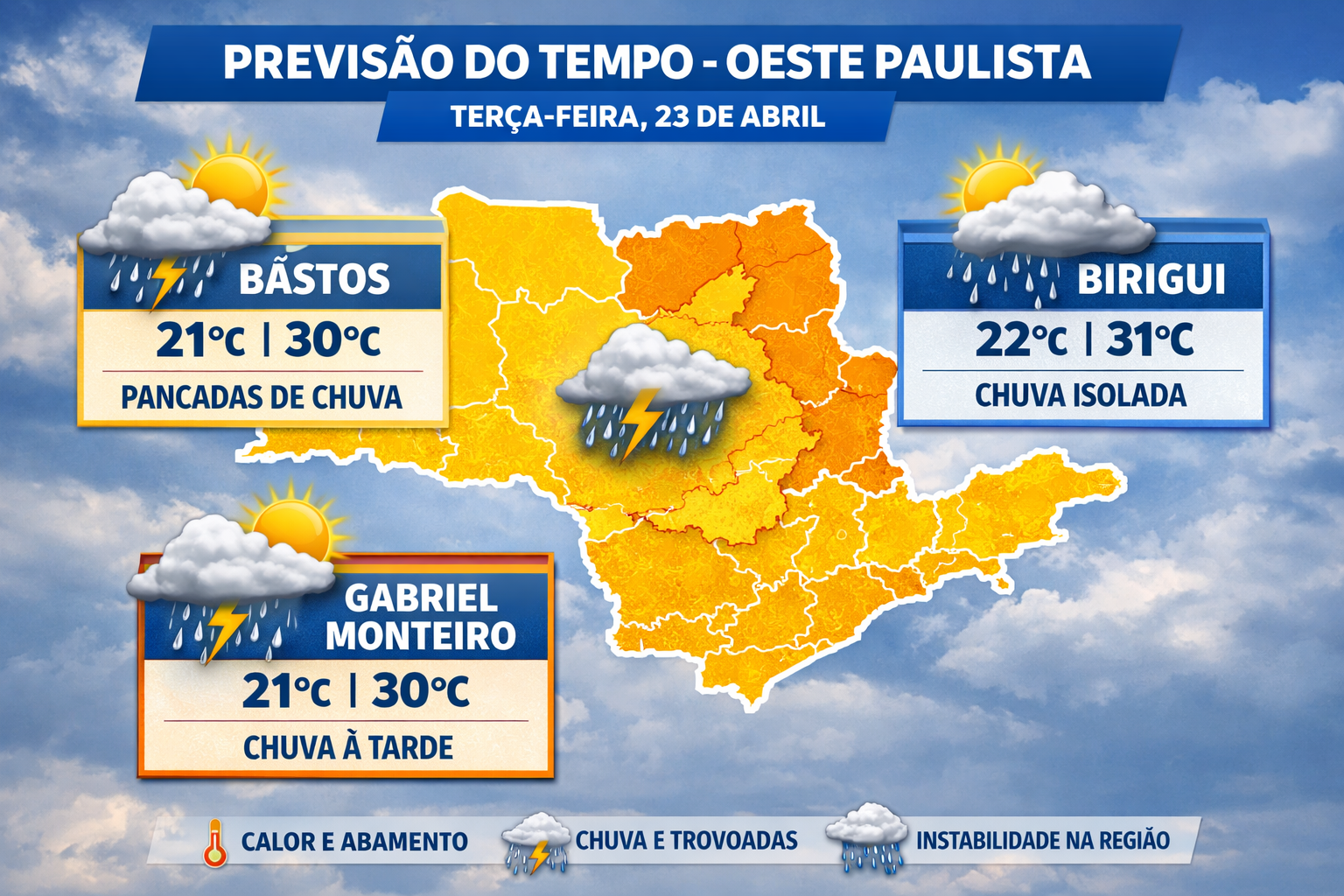 Tempo Oeste Paulista tem dia abafado, com áreas de instabilidade e previsão de novas pancadas de chuva 20 de março de 2026 Nenhum comentário