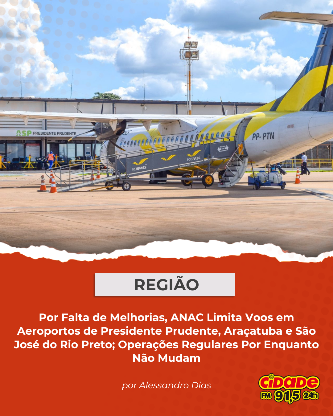 Geral REGIÃO: Por Falta de Melhorias, ANAC Limita Voos em Aeroportos de Presidente Prudente, Araçatuba e São José do Rio Preto; Operações Regulares Por Enquanto Não Mudam 17 de outubro de 2025 Nenhum comentário