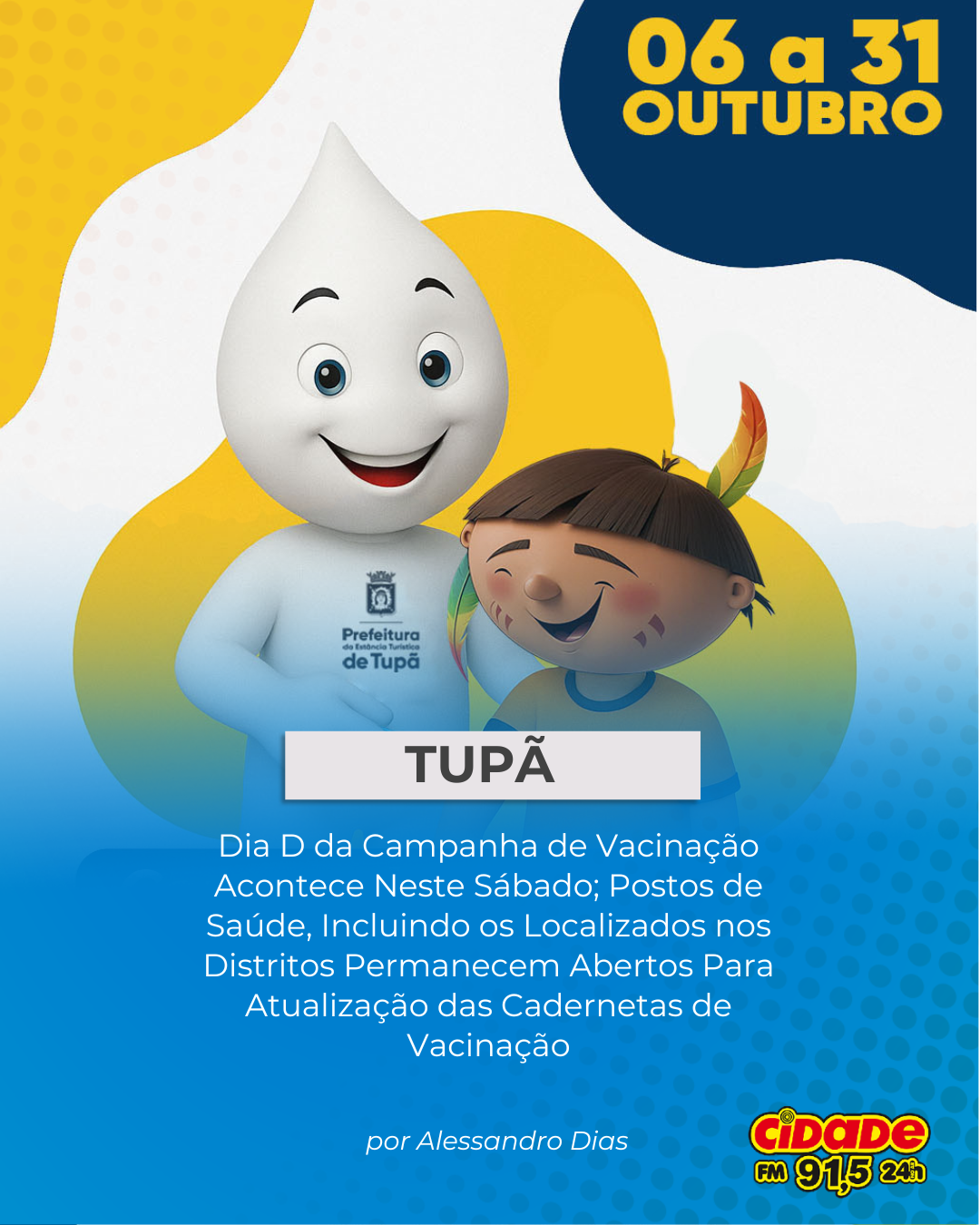 Geral TUPÃ: Dia D da Campanha de Vacinação Acontece Neste Sábado; Postos de Saúde, Incluindo os Localizados nos Distritos Permanecem Abertos Para Atualização das Cadernetas de Vacinação 17 de outubro de 2025 Nenhum comentário