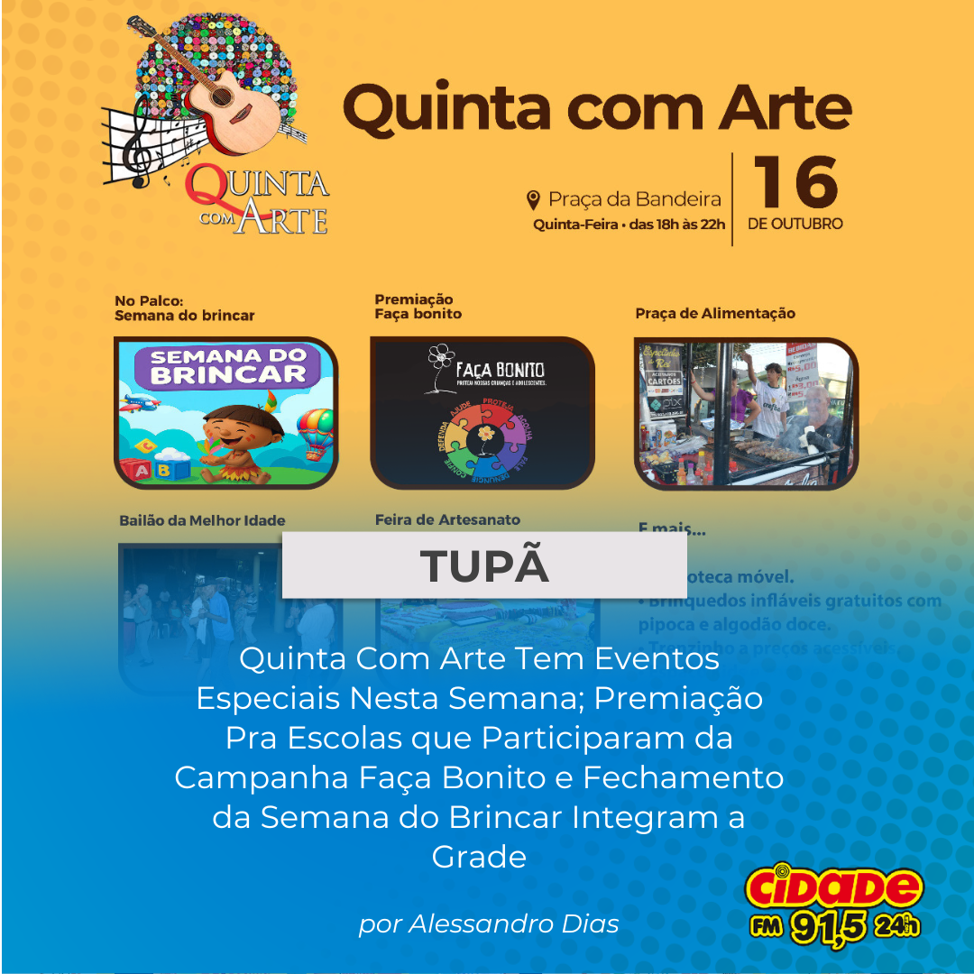 Geral TUPÃ: Quinta Com Arte Tem Eventos Especiais Nesta Semana; Premiação Pra Escolas que Participaram da Campanha Faça Bonito e Fechamento da Semana do Brincar Integram a Grade 15 de outubro de 2025 Nenhum comentário