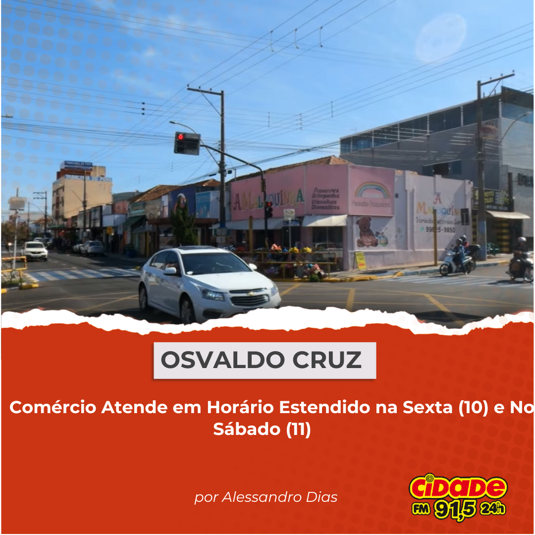 Geral OSVALDO CRUZ: Comércio Atende em Horário Estendido na Sexta (10) e No Sábado (11) 9 de outubro de 2025 Nenhum comentário