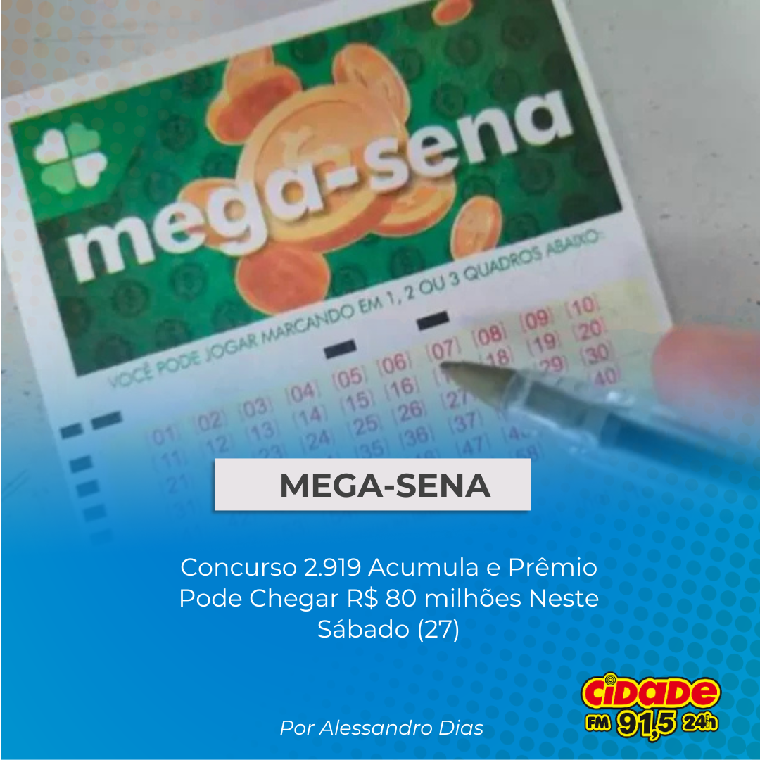 Geral MEGA-SENA: Concurso 2.919 Acumula e Prêmio Pode Chegar R$ 80 milhões Neste Sábado (27) 26 de setembro de 2025 Nenhum comentário