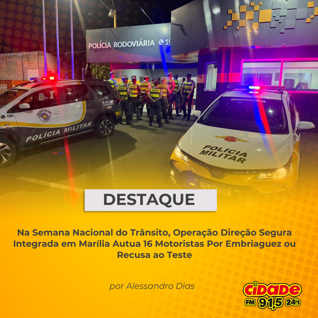 Geral DESTAQUE: Na Semana Nacional do Trânsito, Operação Direção Segura Integrada em Marília Autua 16 Motoristas Por Embriaguez ou Recusa ao Teste 19 de setembro de 2025 Nenhum comentário