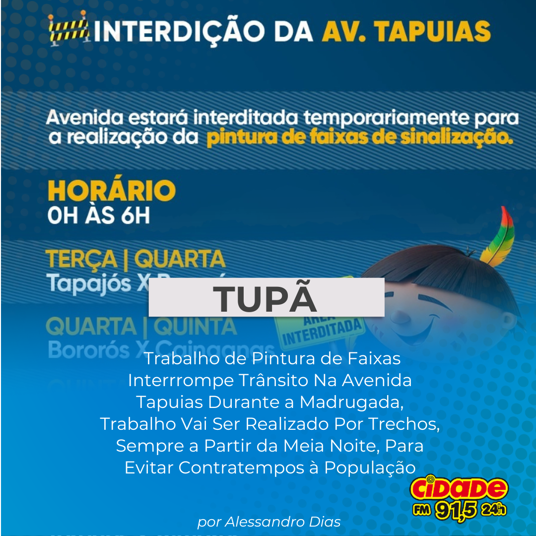 Geral TUPÃ: Trabalho de Pintura de Faixas Interrrompe Trânsito Na Avenida Tapuias Durante a Madrugada, Trabalho Vai Ser Realizado Por Trechos, Sempre a Partir da Meia Noite, Para Evitar Contratempos à População 23 de julho de 2025 Nenhum comentário