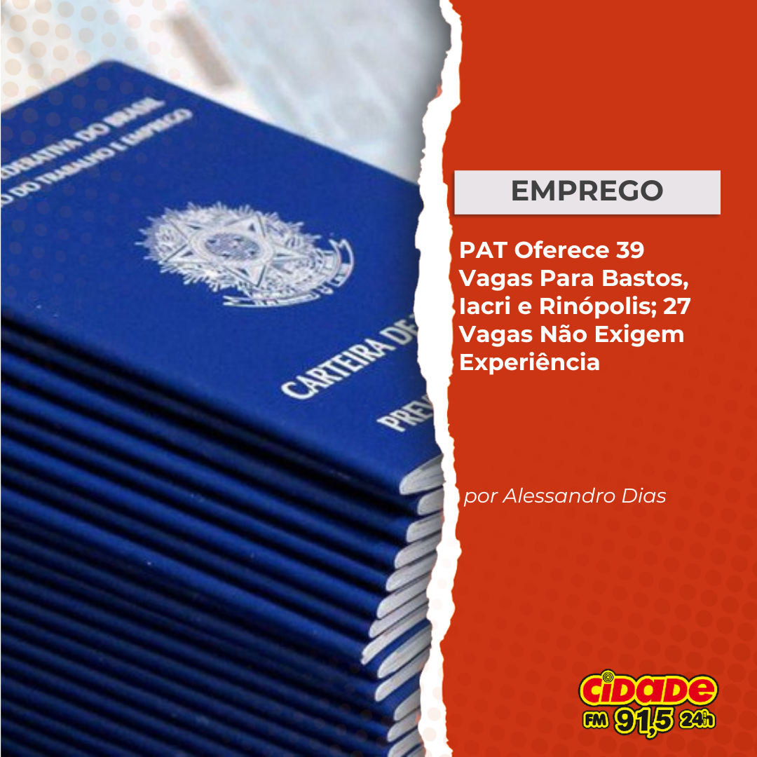 Geral EMPREGO: PAT Oferece 39 Vagas Para Bastos, Iacri e Rinópolis; 27 Vagas Não Exigem Experiência 28 de abril de 2025 Nenhum comentário