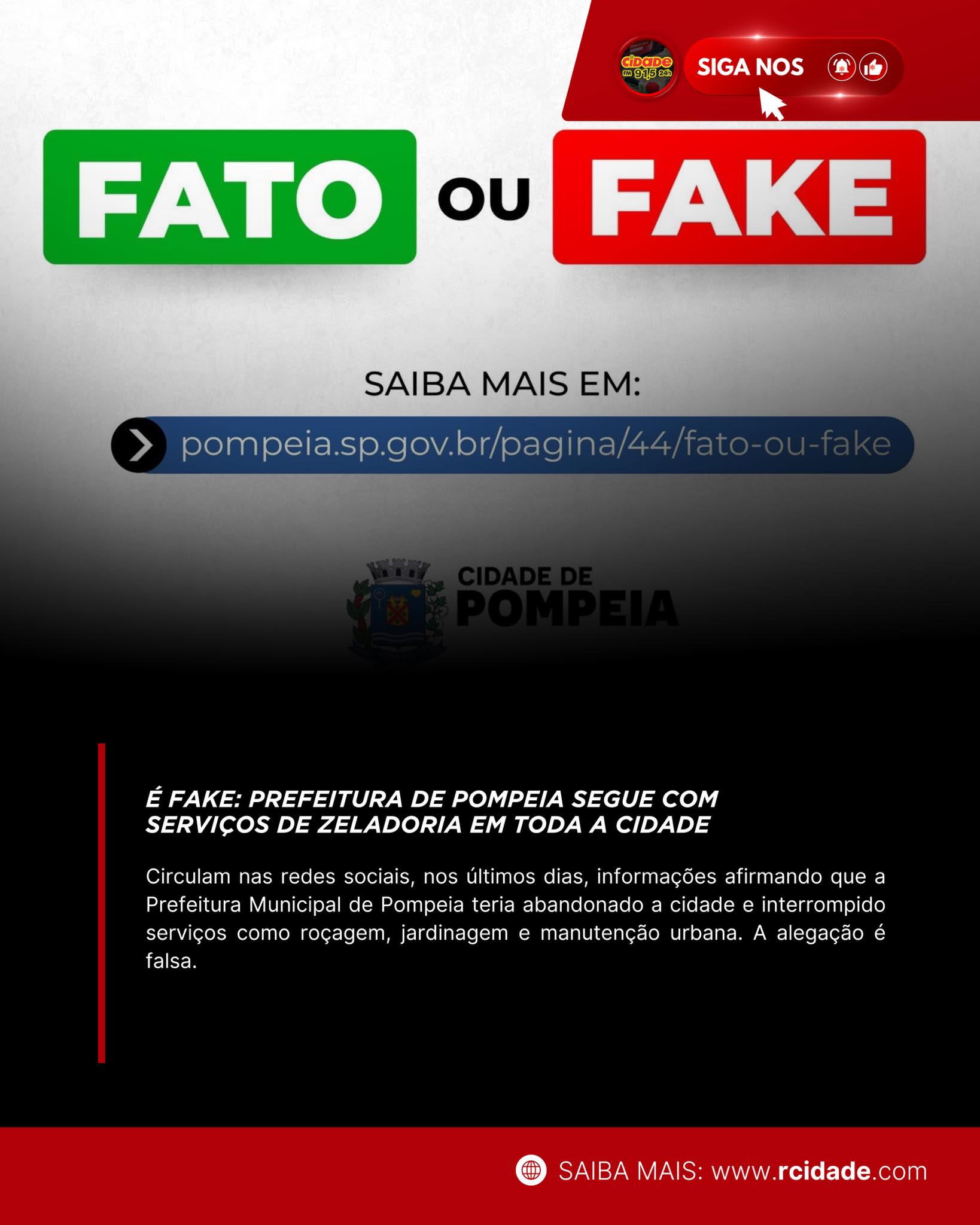 Geral Pompeia desmente fake news e reafirma continuidade dos serviços de limpeza e manutenção 24 de fevereiro de 2026 Nenhum comentário