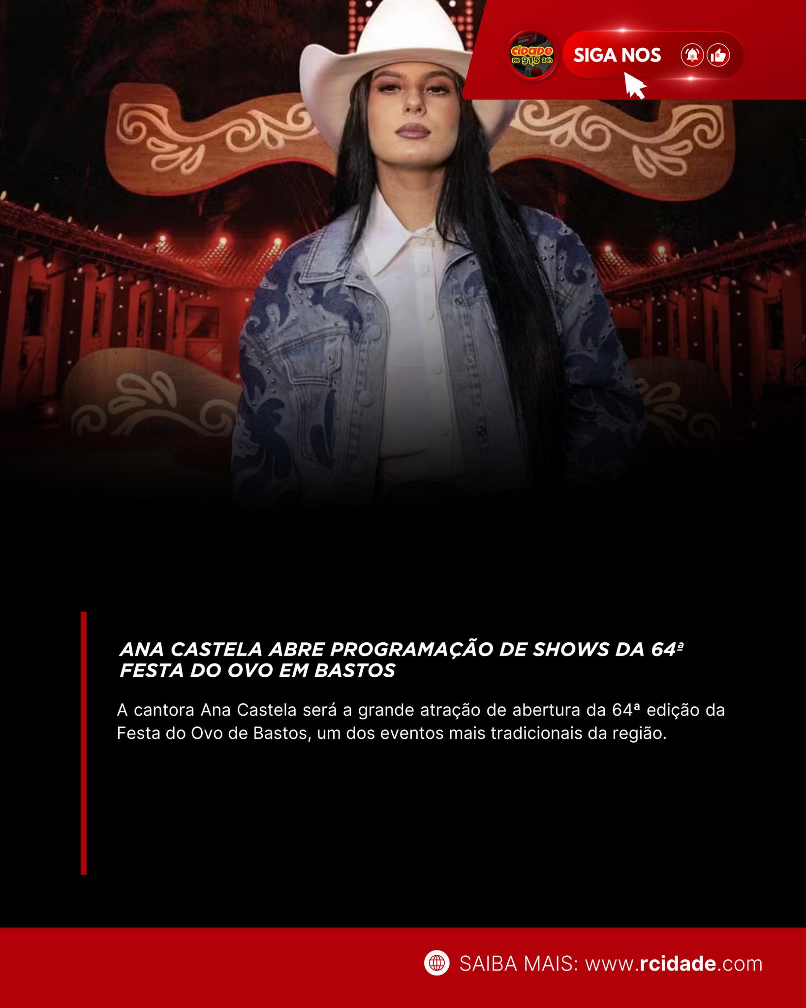 Geral A cantora Ana Castela será a grande atração de abertura da 64ª edição da Festa do Ovo de Bastos 20 de fevereiro de 2026 Nenhum comentário