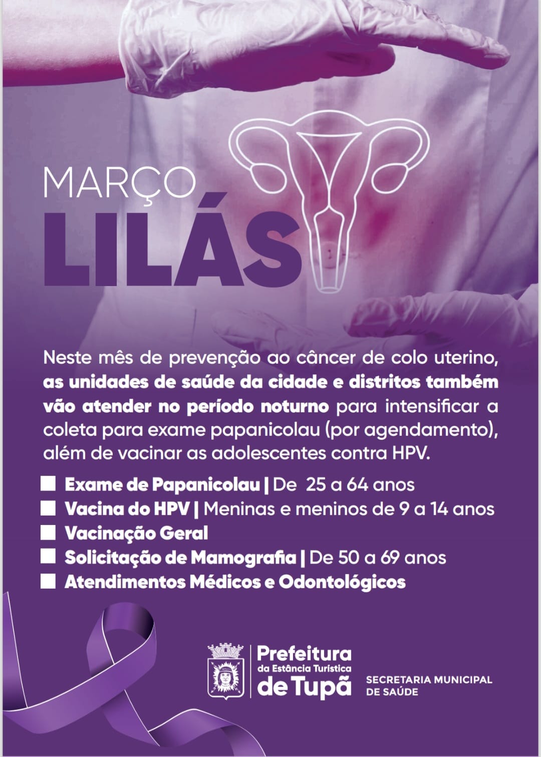 Geral TUPÃ: Campanha Março Lilás Chama Atenção Para a Prevenção do Câncer de Colo de Útero; Rede Municipal de Saúde Atenderá Em Horário Especial Estendido Para Mulheres Durante Todo o Mês 10 de março de 2025 Nenhum comentário