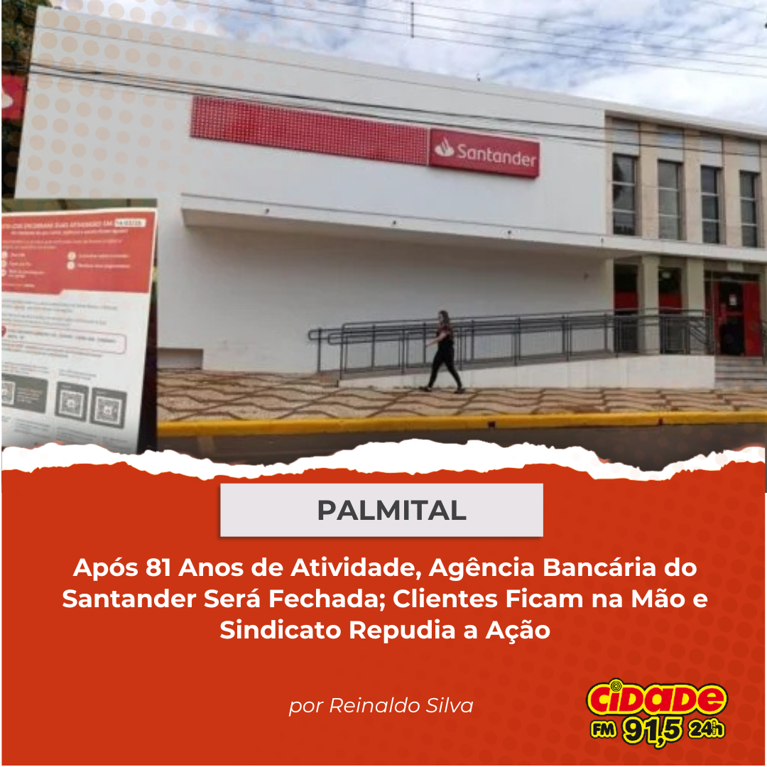 Geral PALMITAL: Após 81 Anos de Atividades, Agência Bancária do Santander Será Fechada; Clientes Ficam na Mão e Sindicato Repudia Decisão 15 de fevereiro de 2025 Nenhum comentário