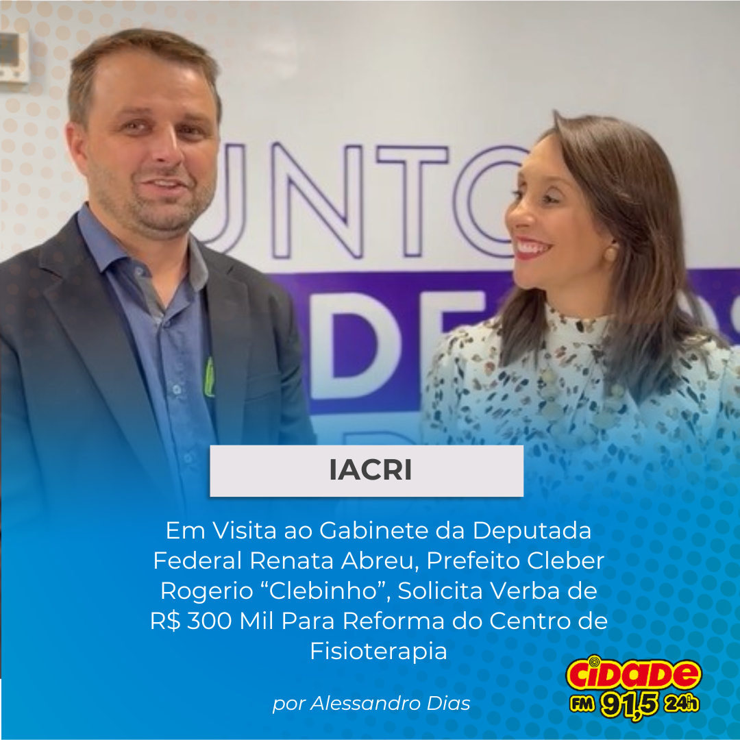 Geral IACRI: Em Visita ao Gabinete da Deputada Renata Abreu, Prefeito Cleber Rogerio “Clebinho”, Solicita Verba de R$ 300 Mil Para Reforma do Centro de Fisioterapia 12 de fevereiro de 2025 Nenhum comentário