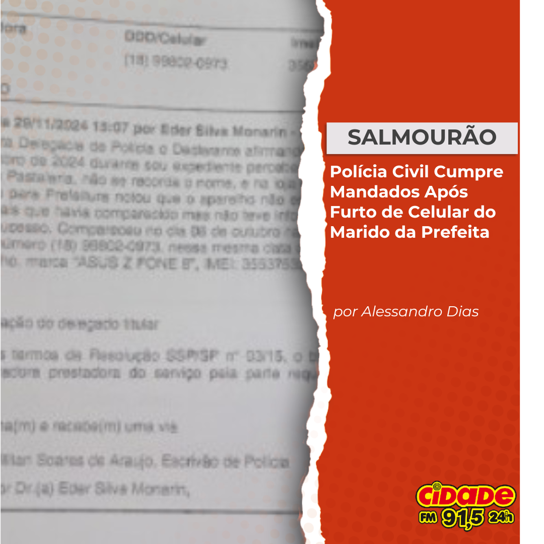 Geral SALMOURÃO: Polícia Civil Cumpre Mandados Após Furto de Celular do Marido da Prefeita 16 de janeiro de 2025 Nenhum comentário