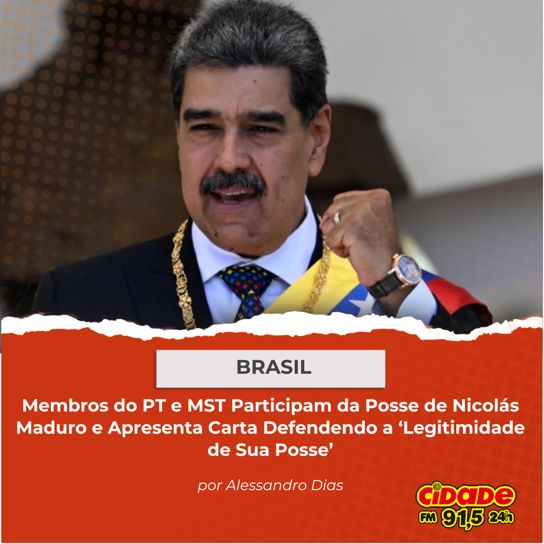 Geral BRASIL: Membros do PT e MST Participam de Posse de Nicolás Maduro e Apresenta Carta Defendendo a ‘Legitimidade de Sua Posse’ 12 de janeiro de 2025 Nenhum comentário