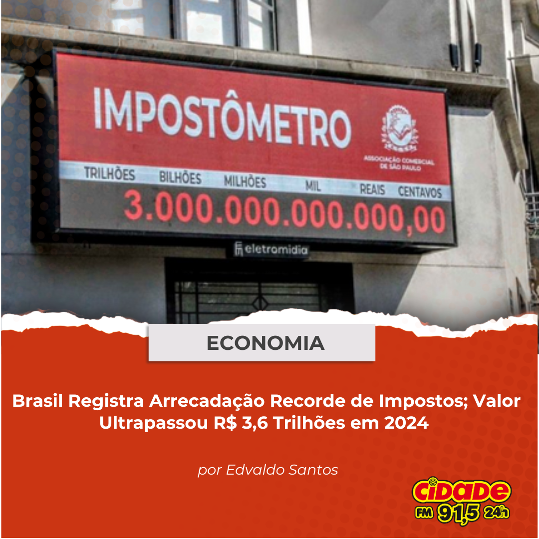 Geral ECONOMIA: Brasil Registra Arrecadação Recorde de Impostos; Valor Ultrapassou R$ 3,6 Trilhões em 2024 2 de janeiro de 2025 Nenhum comentário