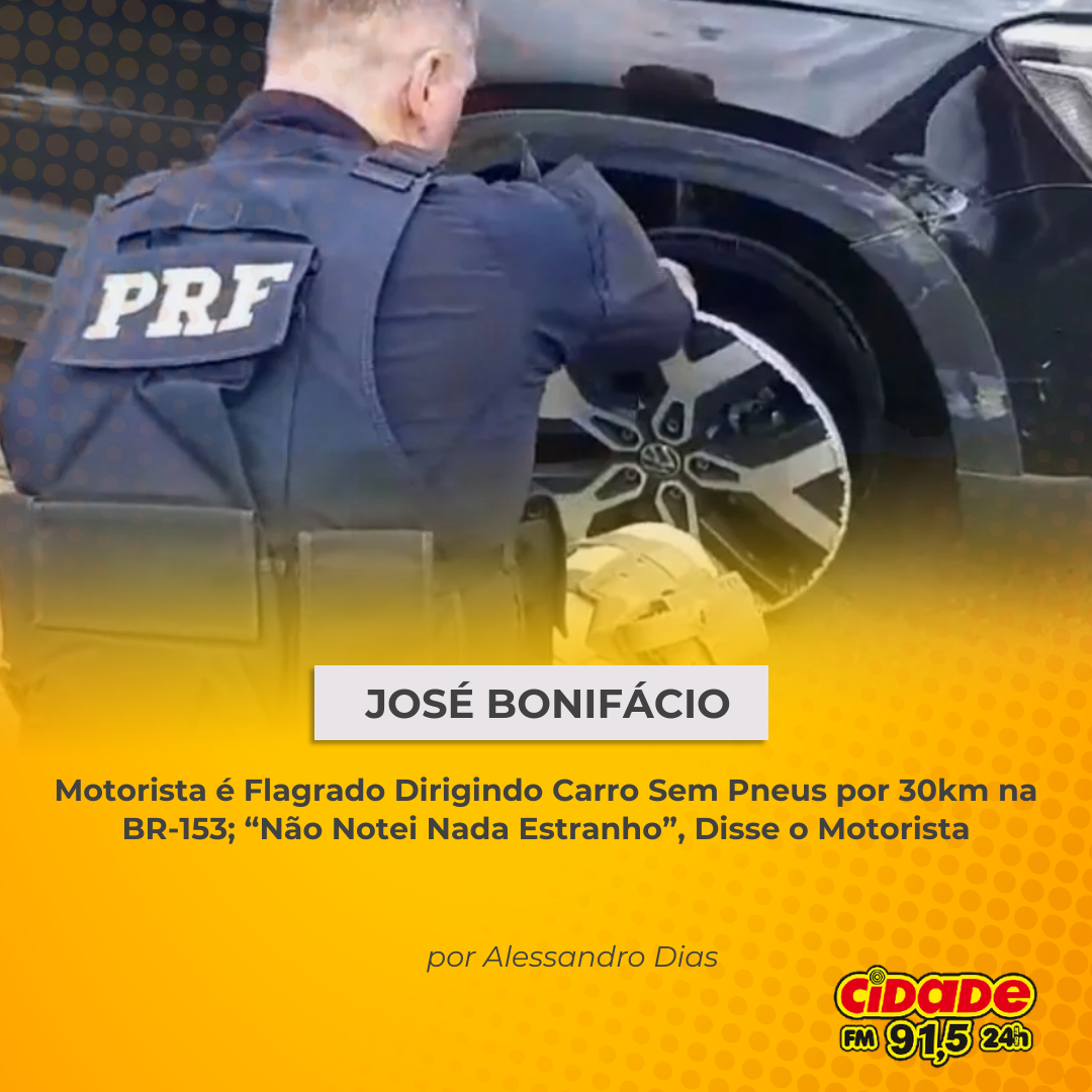 Geral JOSÉ BONIFÁCIO: Motorista é Flagrado Dirigindo Carro Sem Pneus por 30 km na BR-153; “Não Notei Nada Estranho”, Disse Motorista 29 de dezembro de 2024 Nenhum comentário