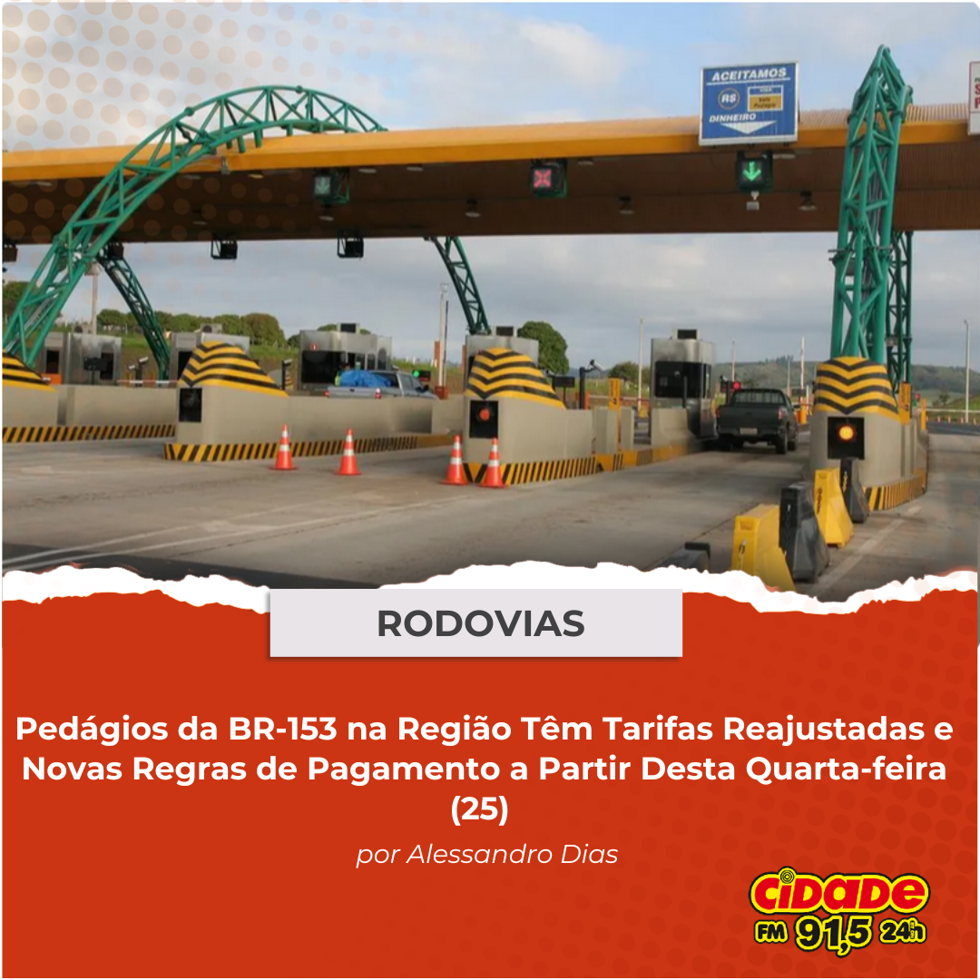 Geral RODOVIAS: Pedágios da BR-153 na Região Têm Tarifas Reajustadas e Novas Regras de Pagamento a Partir desta Quarta-feira (25) 25 de dezembro de 2024 Nenhum comentário
