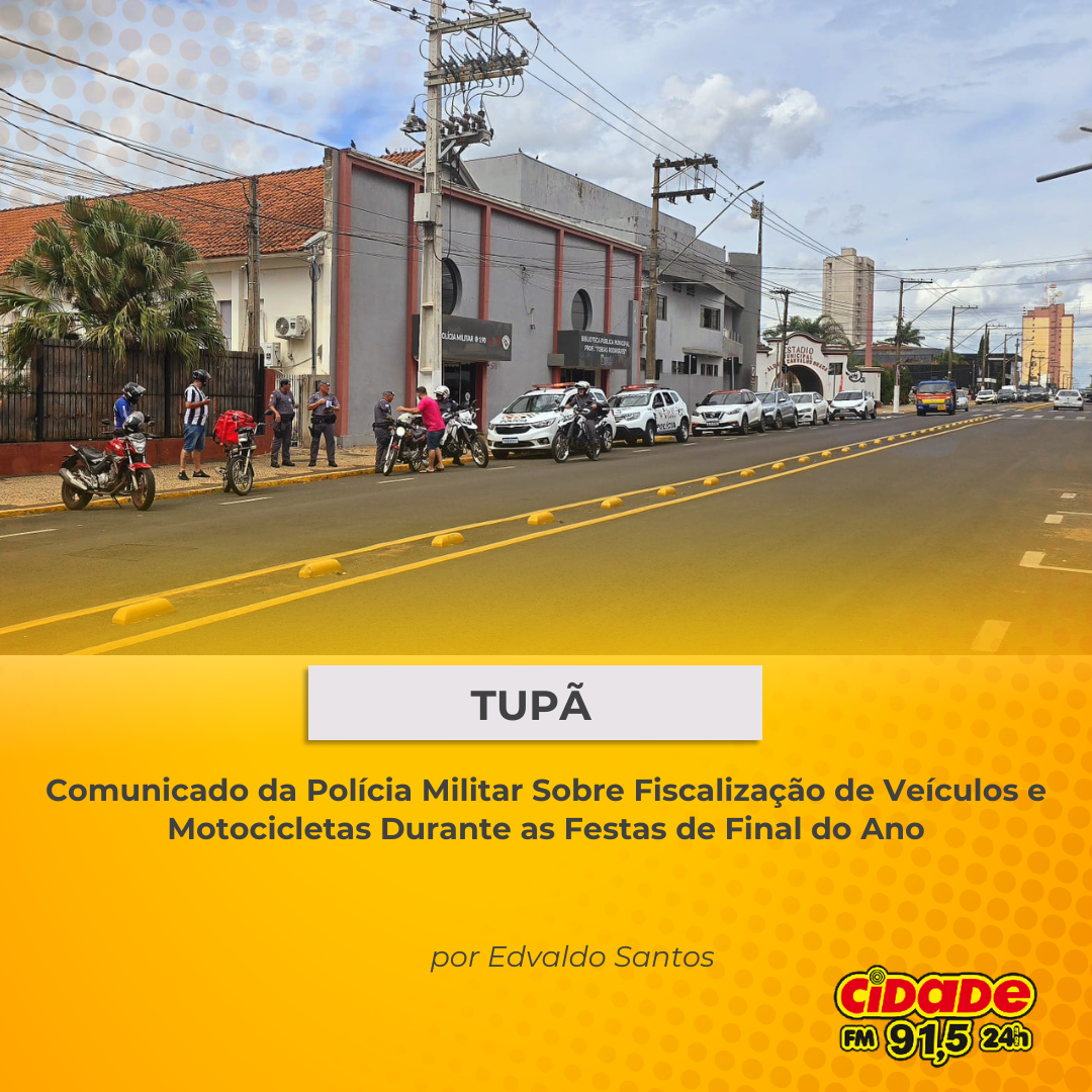 Geral TUPÃ: Comunicado da Polícia Militar Sobre Fiscalização de Veículos e Motocicletas Durante as Festas de Final do Ano 20 de dezembro de 2024 Nenhum comentário