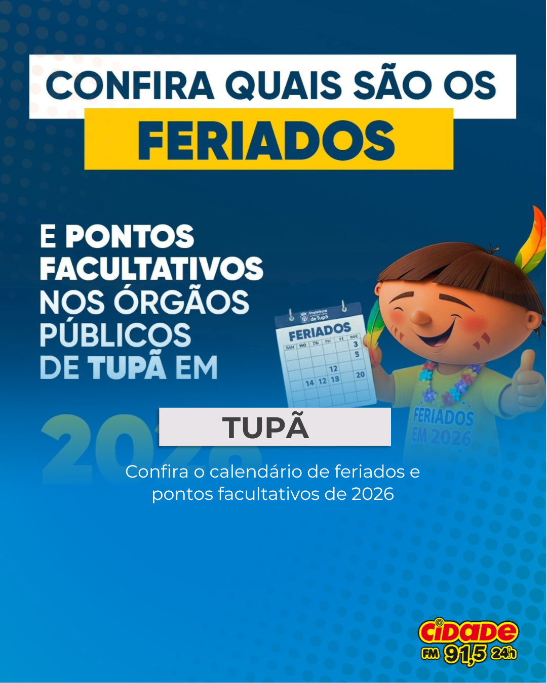 Geral TUPÃ: Confira o calendário de feriados e pontos facultativos de 2026 6 de janeiro de 2026 Nenhum comentário