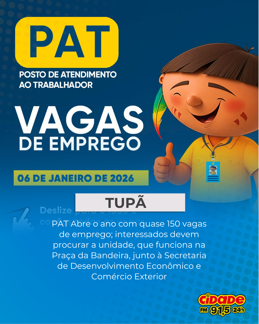 Geral TUPÃ: PAT Abre o ano com quase 150 vagas de emprego; interessados devem procurar a unidade, que funciona na Praça da Bandeira, junto à Secretaria de Desenvolvimento Econômico e Comércio Exterior 6 de janeiro de 2026 Nenhum comentário